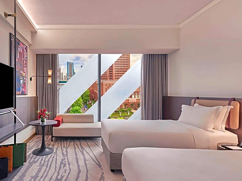 PRESIDENTIAL SUITE, 1 King Bed, 1 Queen Bed, Orchard Road View is 1249 square feet and includes either a queen-size bed 150-154 width or a king-size bed 150-183 width plus living room, desk, satellite tv , hairdryer, tea and coffee making facilities , ironing set, and bathrobes.